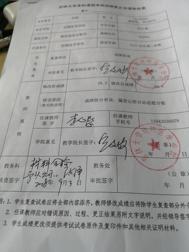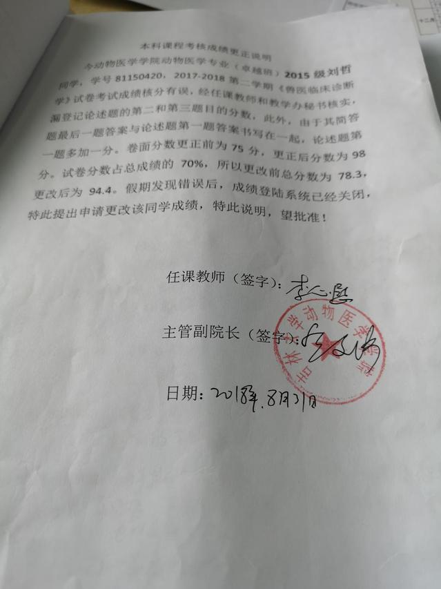 根据《关于进一步明确本科生课程考核等有关问题的通知》(校教字〔2018〕47号)文件有关精神,现对FUN88乐天使2015年级动物医学专业刘哲同学(学号:86150318)2017-2018-2学期兽医临床诊断学课程成绩更正如下: