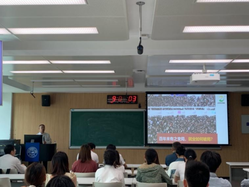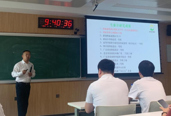 接下来,姜殿国副总经理通过讲解人生幸福模型、老员工职业生涯模型、职业发展三年一个阶段、“三业”认知模型,确定岗位就业等内容引导同学们对职业规划的系统性思考。同时以生泰尔集团事业板块为例,为同学们分析了动物保健品行业的就业岗位。