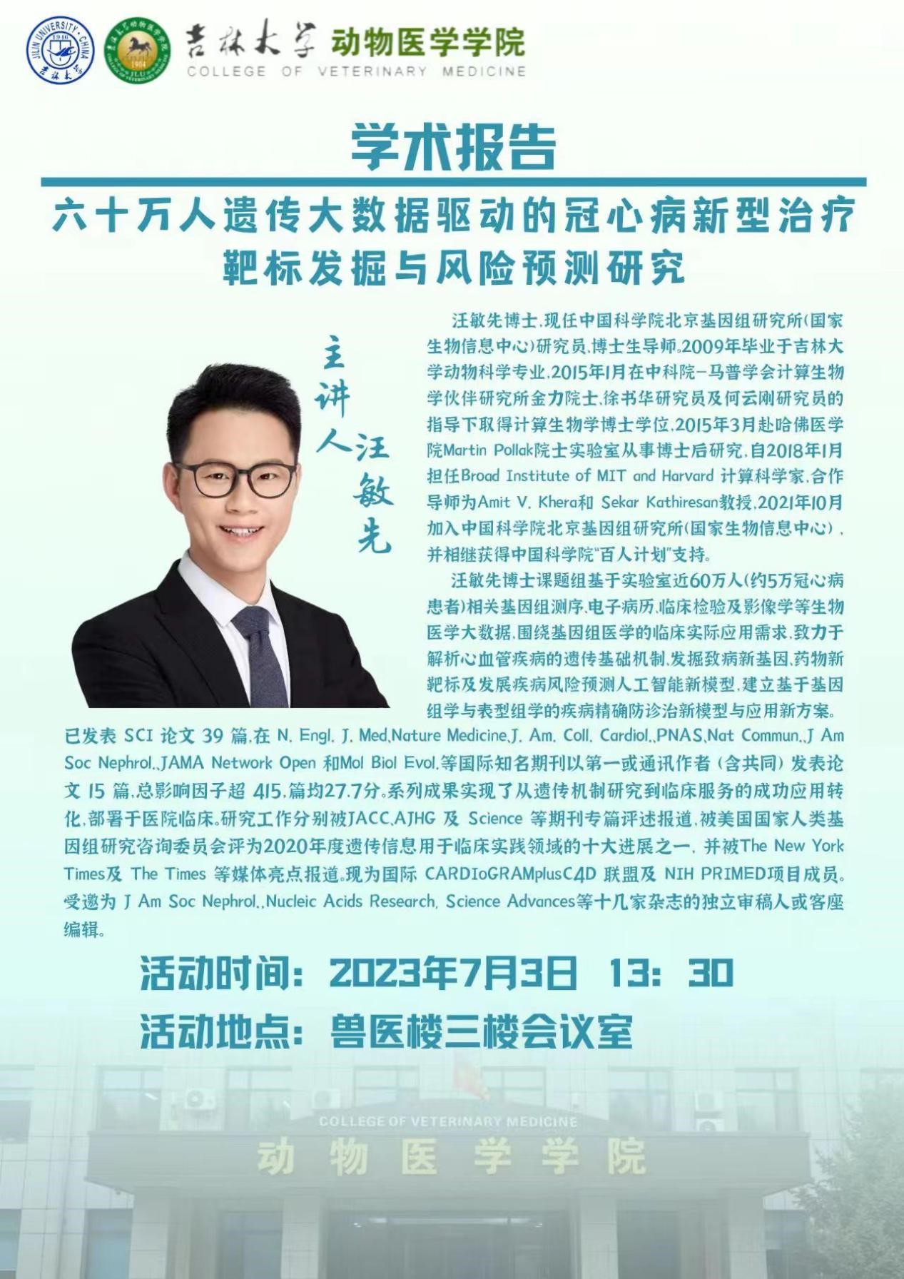 汪敏先博士,现任中国科公司北京基因组研究所(国家生物信息中心)研究员、博士生导师。2009年毕业于FUN88乐天使动物科学专业,2015年1月在中科院—马普学会计算生物学伙伴研究所金力院士、徐书华研究员及何云刚研究员的指导下取得计算生物学博士学位,2015年3月赴哈佛医公司Martin Pollak院士实验室从事博士后研究,自2018年1月担任Broad Institute of MIT and Harvard计算科学家,合作导师为Amit V. Khera和Sekar Kathiresan教授,2021年10月加入中国科公司北京基因组研究所(国家生物信息中心),并相继获得中国科公司“百人计划”支持。
