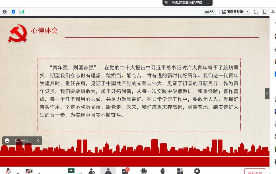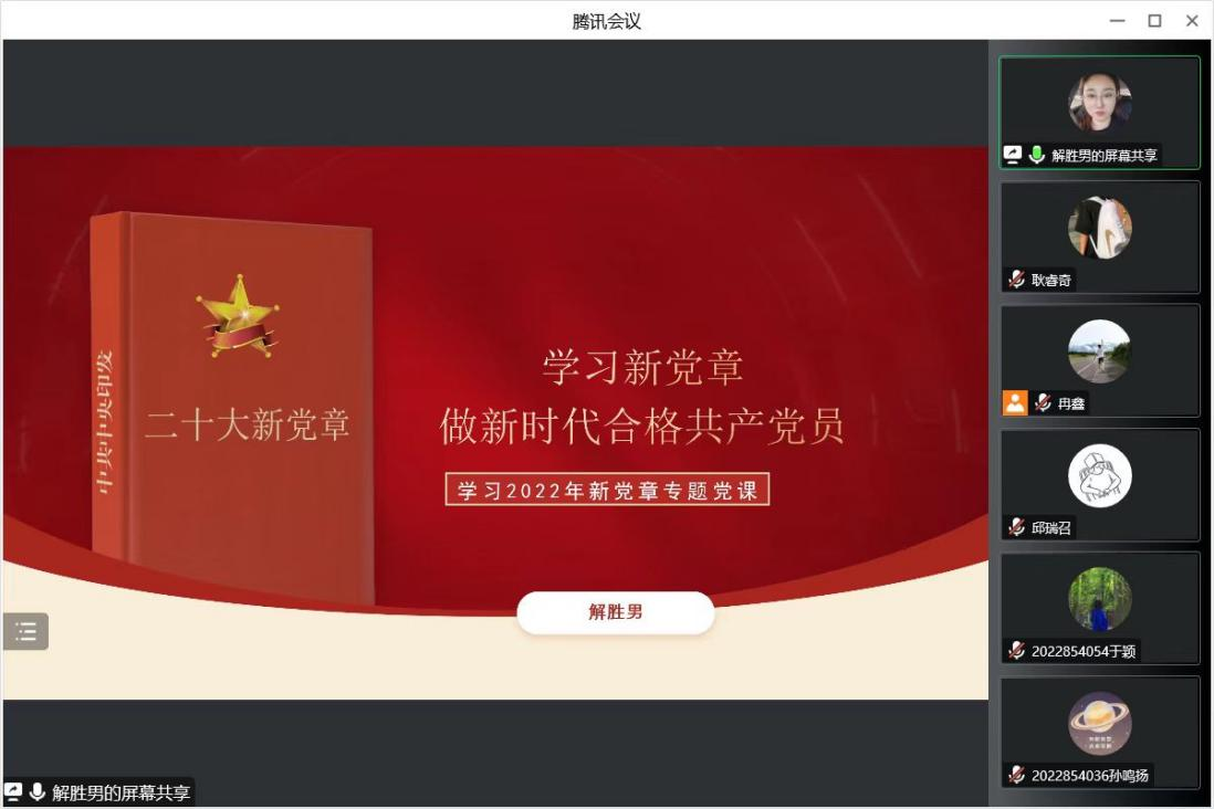 会议上,首先由党支部解胜男同志以《学习新党章 做新时代合格共产党员》为主题讲授专题党课,解胜男老师从“党的二十大修改《党章》的必要性”、“2022年党章修改工作主要特点”以及“新党章主要修订内容”三个方面详细讲解学习新党章的必要性。随后,每位党员同志结合自己学习党的二十大的感悟体会,每人一个专题,分别进行了党的二十大精神微党课讲授,与大家分享了自己的学习心得,进一步增进了大家对党的二十大精神的领悟。