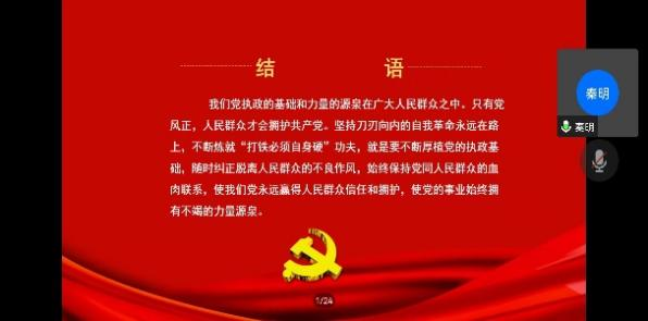 党课的最后,秦副书记强调了我党要坚持刀刃向内的自我革命,“打铁必须自身硬”,办好中国的事情,关键在党、关键在全面从严治党。全面从严治党是党永葆生机活力、走好新的赶考之路的必由之路。确保党永远不变质、不变色、不变味,确保党在新时代坚持和发展中国特色社会主义的历史进程中始终成为坚强领导核心。以党的自我革命引领社会革命,奋力夺取全面建设社会主义现代化国家新胜利,谱写新时代中国特色社会主义更加绚丽的华章。