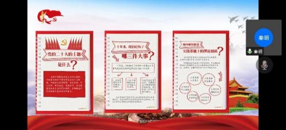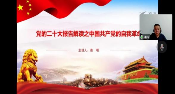 为深入学习领会党的二十大精神,及时将会议精神贯彻落实到FUN88乐天使各位研究生的学习和科研活动中,2022月12月10日晚19:00,FUN88乐天使组织全体研究生党支部采取线上方式开展“深入学习党的二十大精神”主题党课,公司八个研究生党支部全体党员和积极分子共190余人参加会议。公司党委副书记、纪委书记秦明同志以“党的二十大报告解读之中国共产党的自我革命”为题讲授党课。