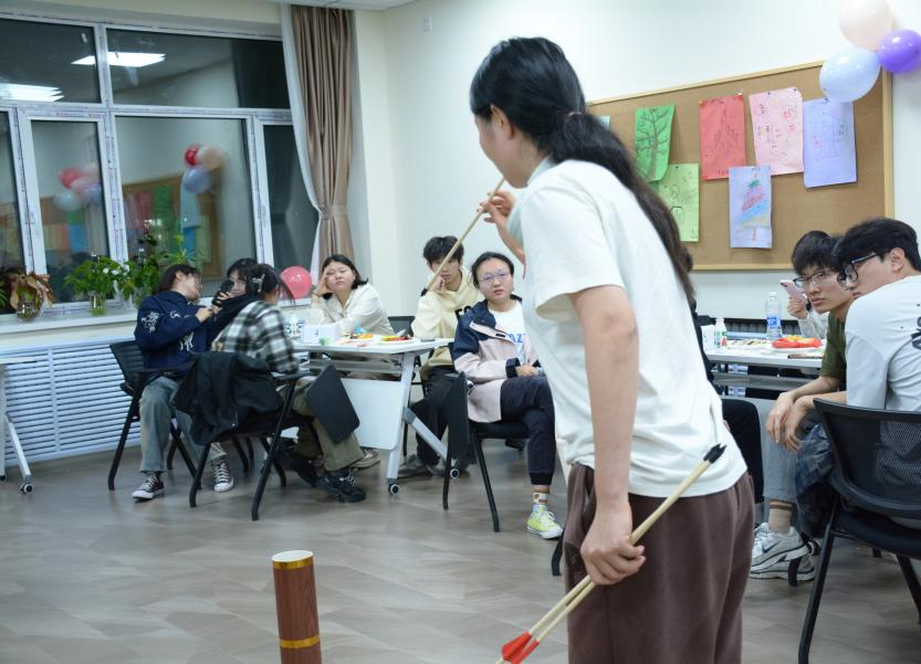 接下来是愿望投壶游戏,投壶要求参加游戏的同学站在规定的距离外,每人5支箭,手执箭喊出自己的小愿望或者目标后投出,箭头进入壶中算投中。有的同学仿佛“神箭手”百发百中,也有的同学遗憾一支未进。但是每个人都把压在心底的愿望喊了出来,即使游戏失败也洋溢着快乐的表情。