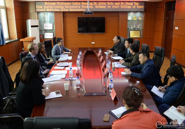2016年4月8日,德国吉森大学中国事务代表罗宾.亨利教授、国际办公室主任沃尔茨.朱丽亚女士及中国事务协调员程严女士一行3人来FUN88乐天使访问交流。常务副经理张西臣教授、研究生副经理雷连成教授、党委副书记饶家辉副教授、基础兽医学系宋德光教授、临床兽医学系李小兵教授、兽医公共卫生学系副主任王新平教授及公司国际交流处合作办学科科长白玉老师和何江海老师与罗宾.亨利教授一行进行了座谈,