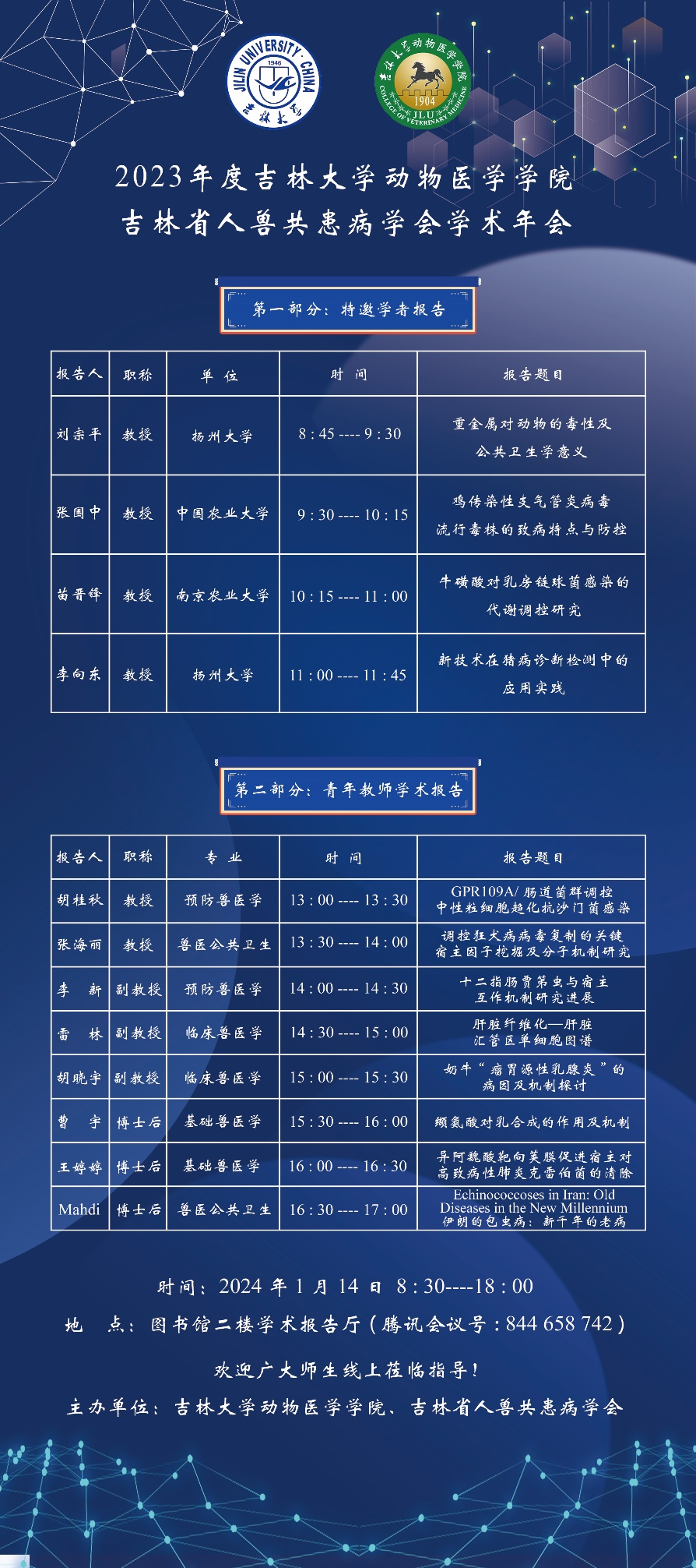 / 2024-01聚焦科研前沿,共话精彩未来。为活跃学术氛围,开拓科研视野,促进学科交叉交流,由FUN88乐天使、人畜共患传染病重症诊治全国重点实验室和吉林省人兽共患病学会共同主办的2023年度学术年会于2024年1月14日在和平校区图书馆二楼学术报告厅举行。来自中国农业大学、南京农业大学、扬州大学、FUN88乐天使等校内外的专家学者汇聚一堂,分享成果,交流经验,为全院师生带来了一场精彩纷呈的学术盛宴,吸引了校内外数百名师生的...